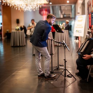 I have multiple wireless microphones in configurations you prefer like: handheld, lapel, and/or headset.  If you want music playing before and after your event, and walk-up music for presenters, I have you covered.  As a unique bonus, I can make professional overhead announcements.  My equipment can cover up to a full convention center ballroom.